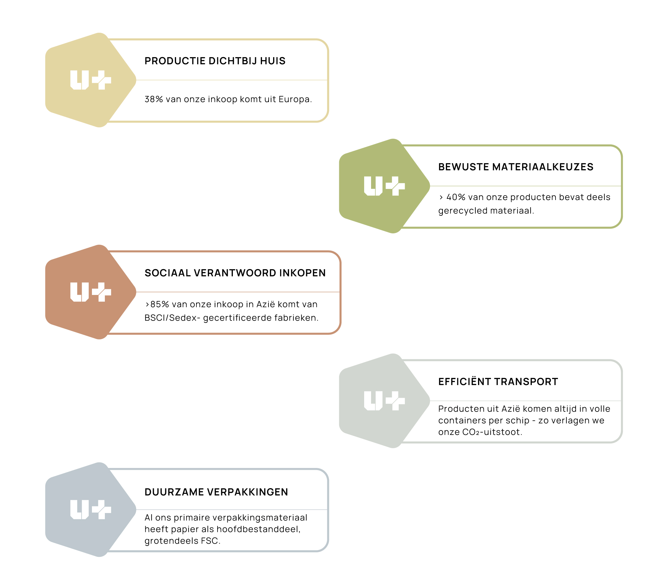U+ beschouwt haar samenwerkingspartners als onlosmakelijk deel van de waardeketen waarin zij actief is en voorwaarde voor duurzaam succes van het bedrijf. Dit vertaalt zich in samenwerkingen met partijen die mee willen gaan op onze duurzaamheidsmissie. We kiezen, zo veel mogelijk, voor BSCI / Sedex gecertificeerde fabrieken en delen onze gedragscode met onze leveranciers. Door betrokkenheid en vertrouwen hebben we langdurige samenwerkingen.